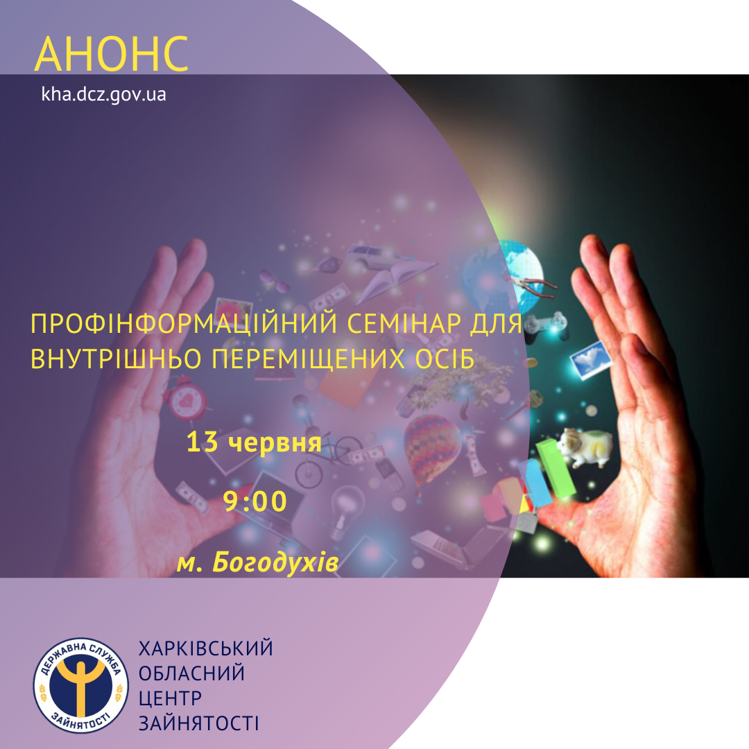 13 червня о 9:00 у Богодухівській філії Харківського обласного центру зайнятості, за адресою: вул. Моргунова, 7, м. Богодухів, пройде профінформаційний семінар для внтурішньо переміщених осіб з числа безробітних та шукачів роботи.