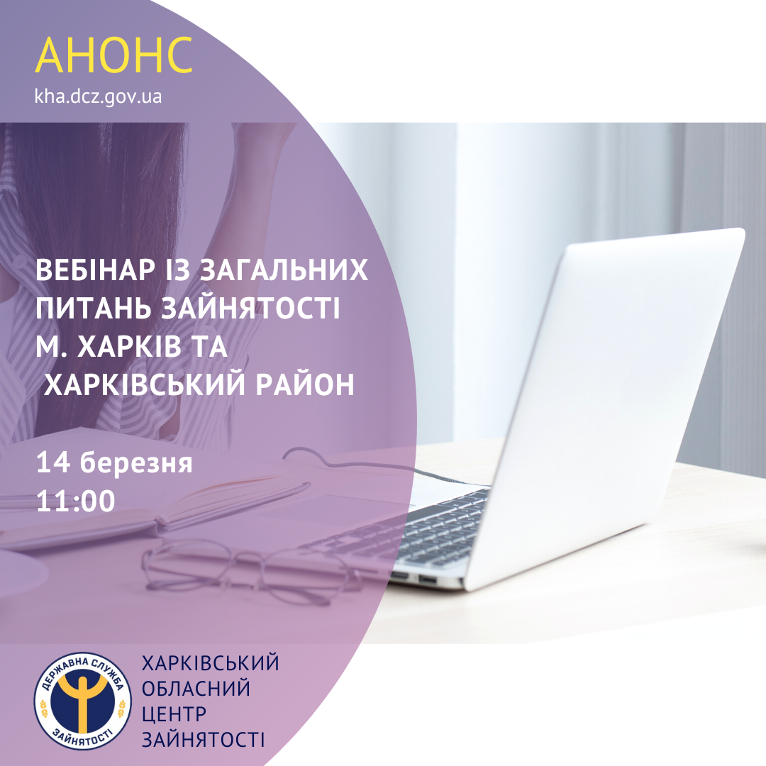 14 березня об 11:00 у Харківській філії Харківського обласного центру зайнятості за адресою: м. Харків, вул. Шевченка, 137-А, відбудеться інформаційний вебінар із загальних питань зайнятості.