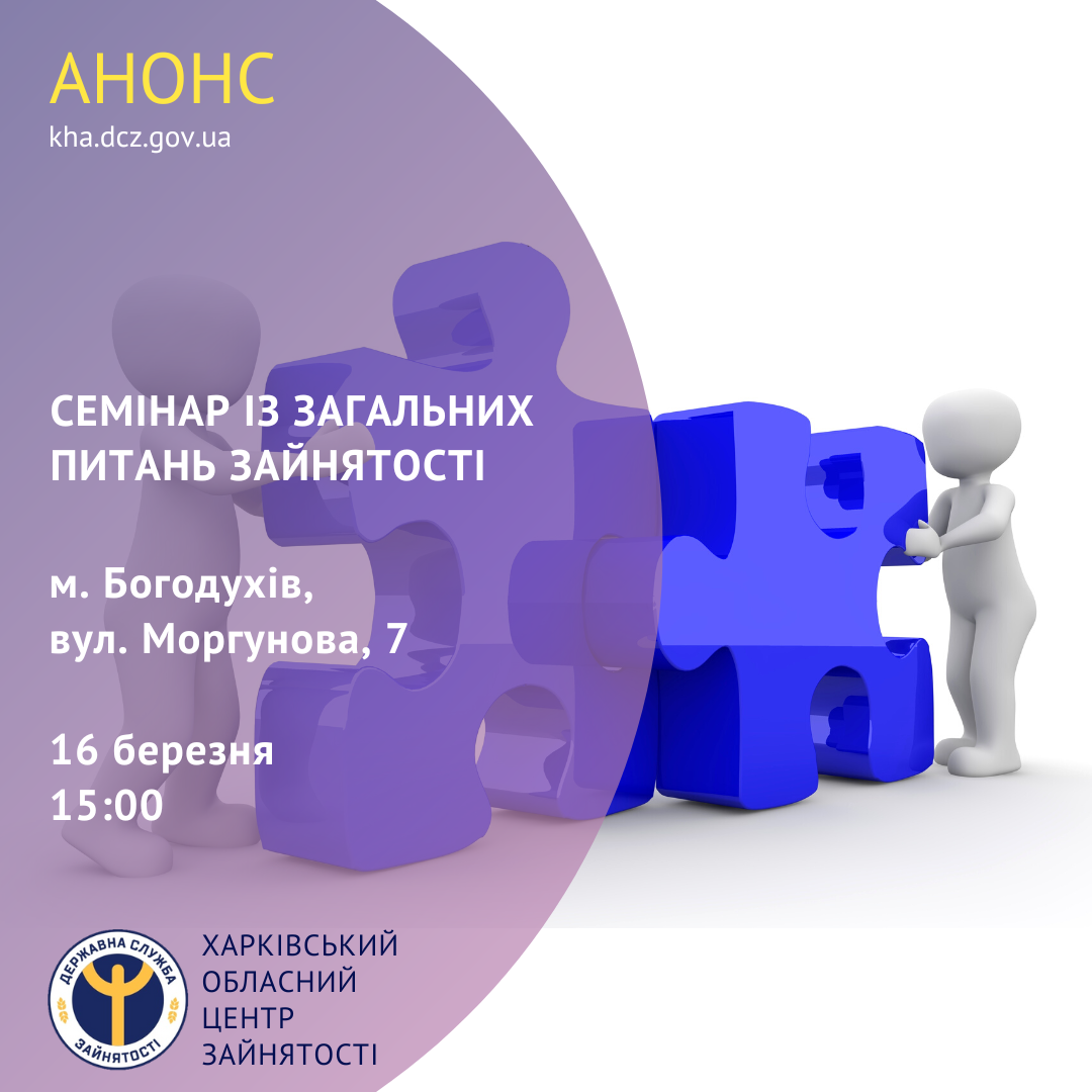 16 березня о 15:00 у Богодухівській філії Харківського обласного центру зайнятості за адресою: м. Богодухів, вул. Моргунова, 7, відбудеться інформаційний семінар із загальних питань зайнятості.