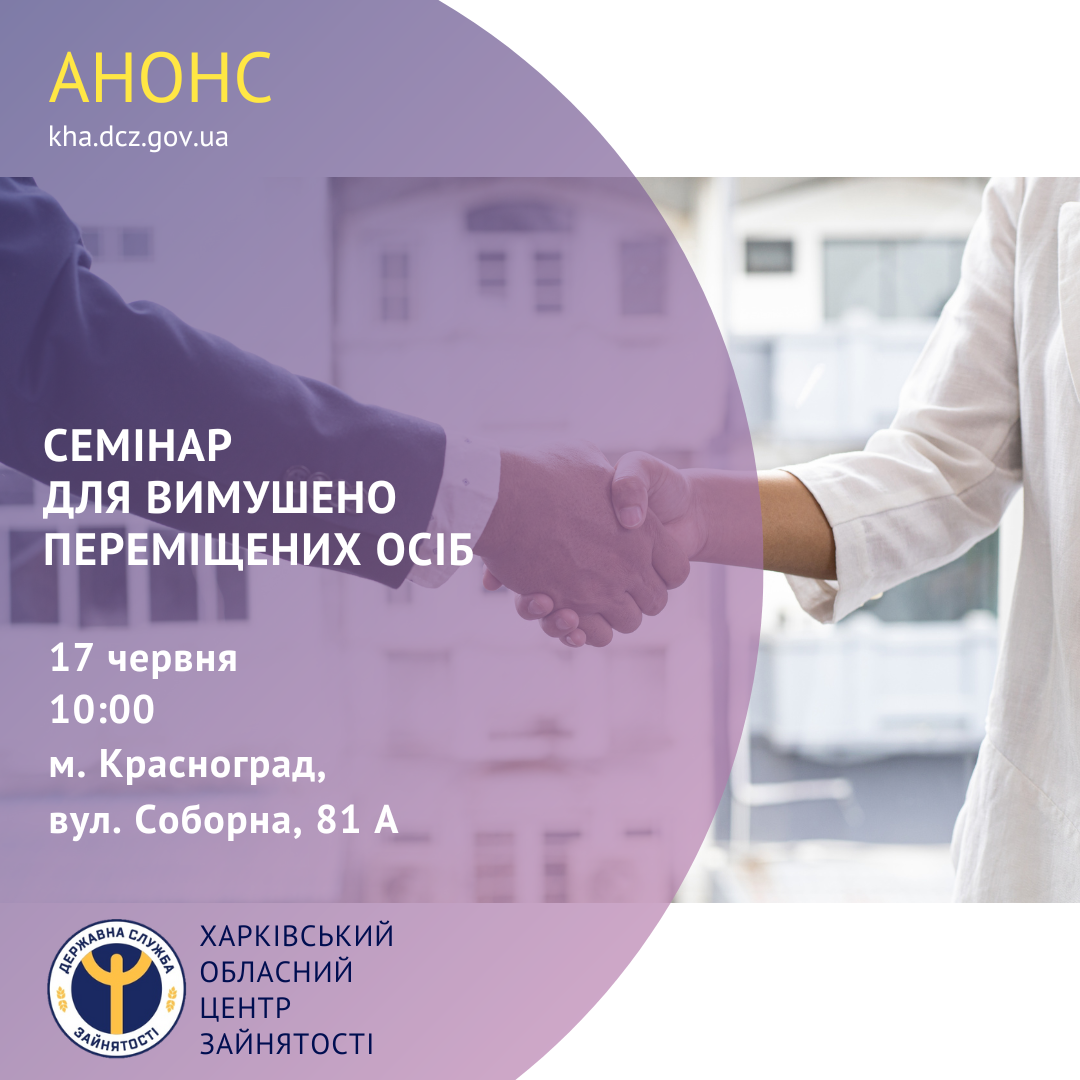 17 червня о 10:00 у Красноградській районній філії ХОЦЗ за адресою: м. Красноград, вул. Соборна, 81 А (каб. №3), фахівці служби зайнятості проведуть профінформаційний семінар для вимушено переміщених осіб, які не перебувають на обліку в службі зайнятості як безробітні.