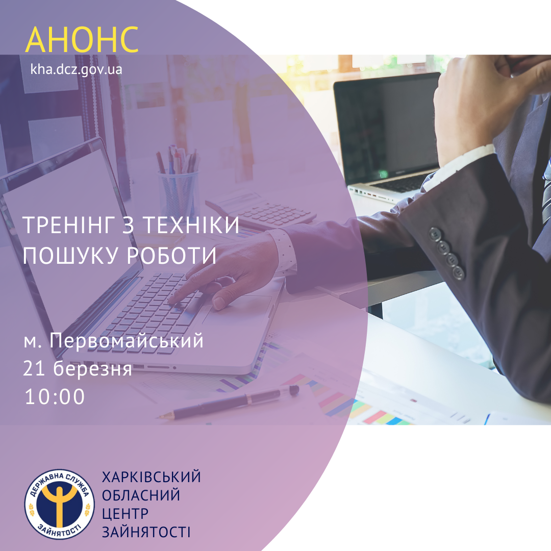 21 березня о 10:00 у Первомайському управлінні Лозівської філії Харківського обласного центру зайнятості, за адресою: вул. Харківська, 66, м. Первомайський, відбудеться тренінг з техніки пошуку роботи для безробітних осіб.