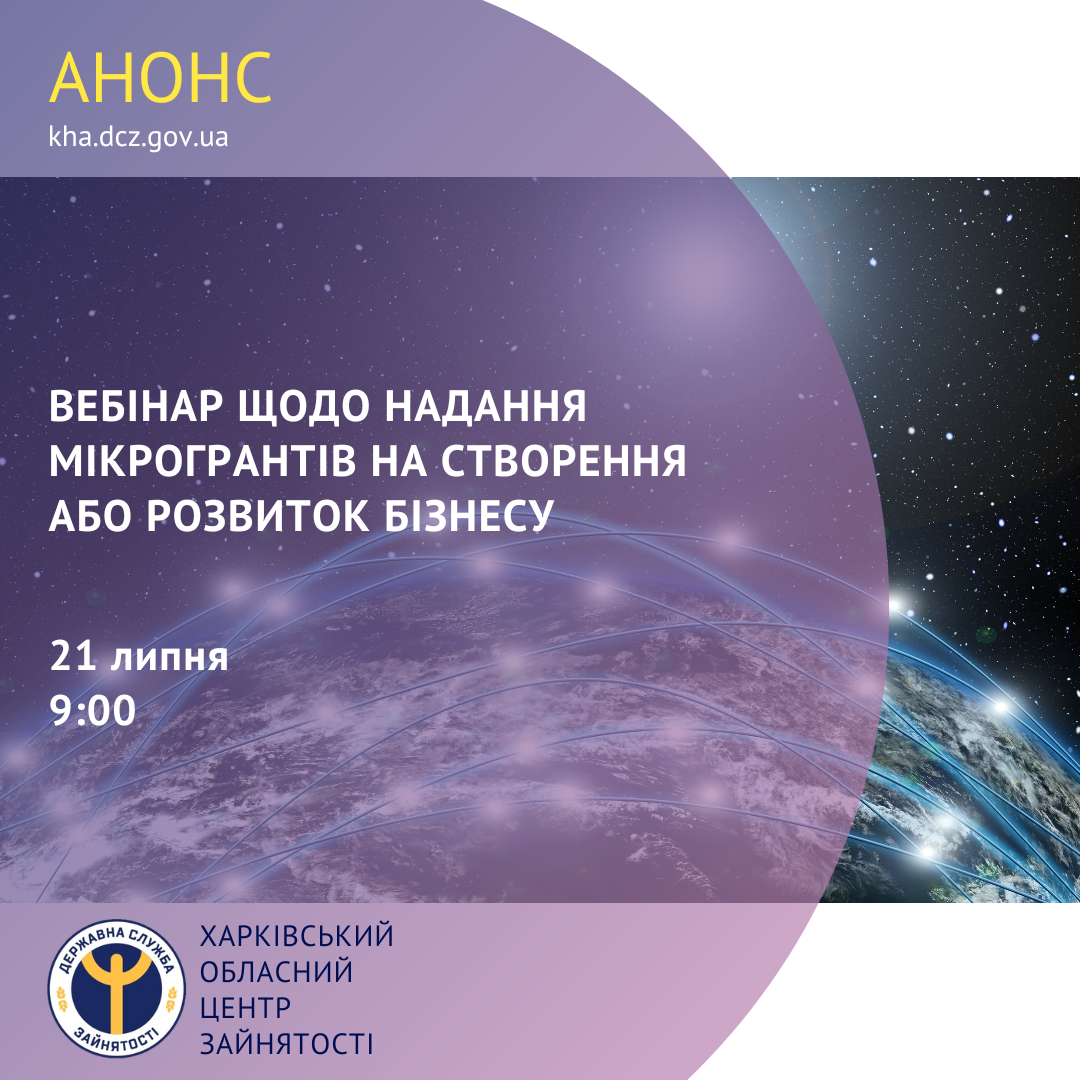 21 липня о 9:00 фахівці Харківського обласного центру зайнятості проведуть інформаційний вебінар щодо надання мікрогрантів на створення або розвиток власного бізнесу.