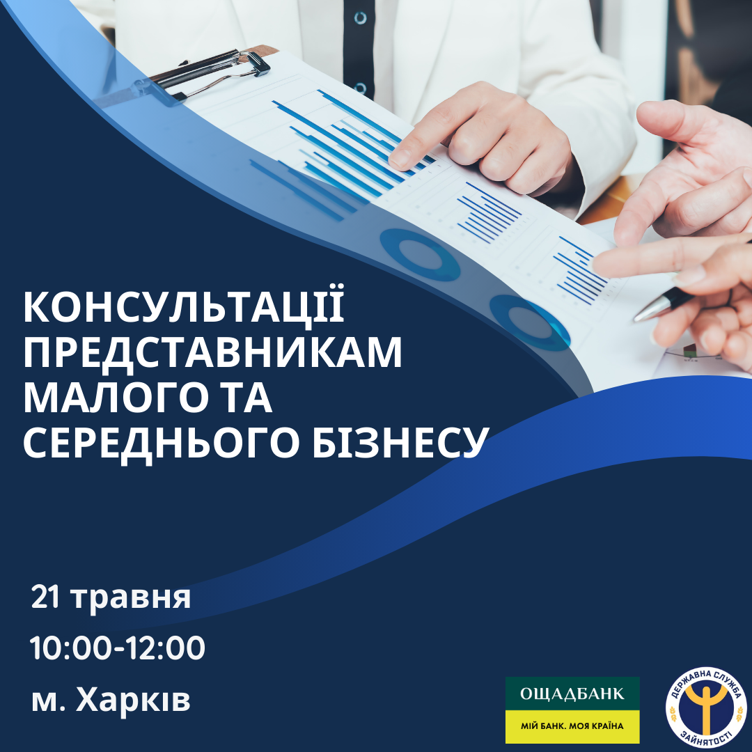 21 травня у приміщенні центрального відділення Ощадбанку за адресою: майдан Конституції, 22, м. Харків, фахівці Харківського обласного центру зайнятості надаватимуть консультації представникам малого та середнього бізнесу.