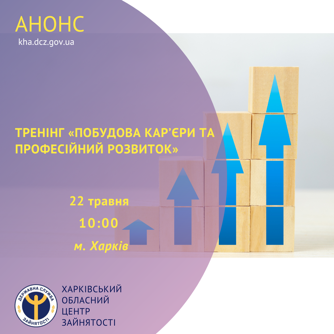 22 травня о 10:00 у Харківській філії Харківського обласного центру зайнятості відбудеться тренінг «Побудова кар’єри та професійний розвиток» для безробітних осіб та шукачів роботи, в тому числі внутрішньо переміщених.