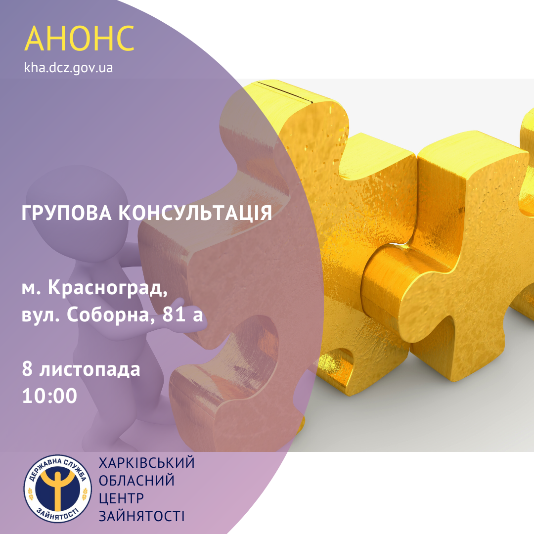 8 листопада о 10:00 у Красноградській районній філії Харківського обласного центру зайнятості за адресою: м. Красноград, вул. Соборна, 81 а, відбудеться групова консультація із залученням фахівців Пенсійного фонду України.