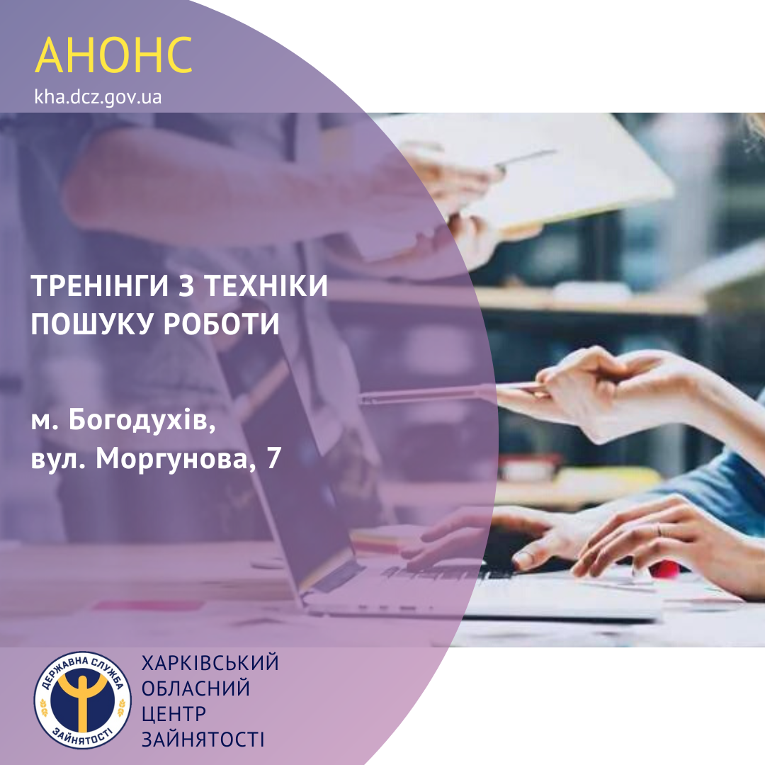 У Богодухівській районній філії Харківського обласного центру зайнятості за адресою: м. Богодухів, вул. Моргунова, 7, проводяться тренінги з техніки пошуку роботи для безробітних громадян, шукачів роботи та внутрішньо переміщених осіб.