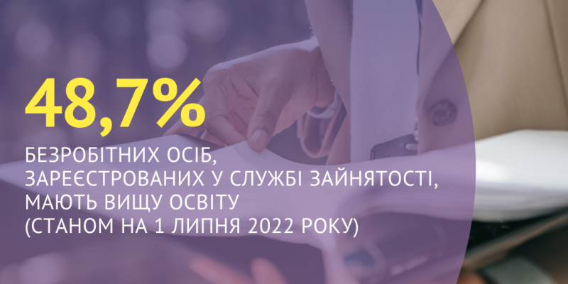 48,7% безробітних осіб, зареєстрованих у Харківській обласній службі зайнятості, мають вищу освіту (станом на 1 липня 2022 року).