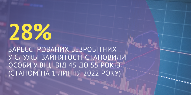 28% зареєстрованих безробітних у Харківській обласній службі зайнятості становили особи у віці від 45 до 55 років (станом на 1 липня 2022 року).