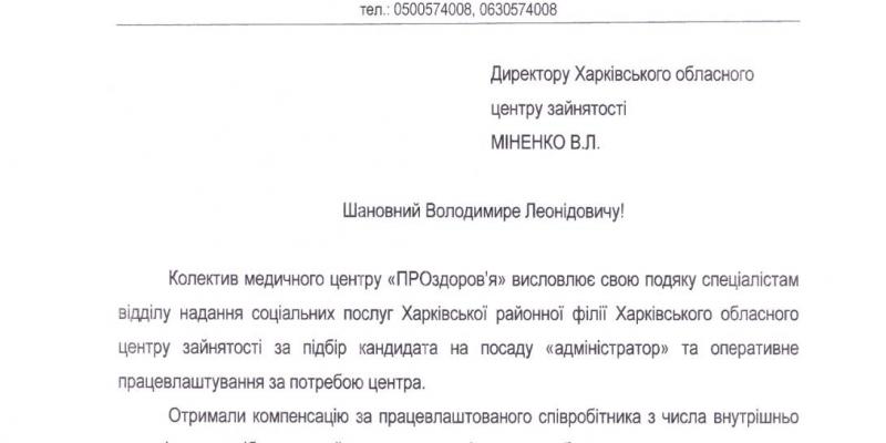 На ім'я директора Харківської обласної служби зайнятості Володимира Міненка надійшла подяка від Медичного центру «ПРОздоров’я» за підбір кандидата на посаду адміністратора фахівцями Харківської районної філії Харківського обласного центру зайнятості.