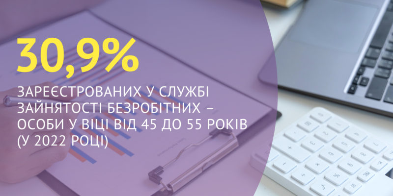 30,9% зареєстрованих у Харківській обласній службі зайнятості безробітних – особи у віці від 45 до 55 років (у 2022 році)