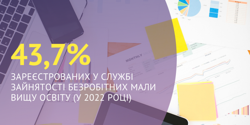 43,7% зареєстрованих у Харківській обласній службі зайнятості безробітних мали вищу освіту (у 2022 році)