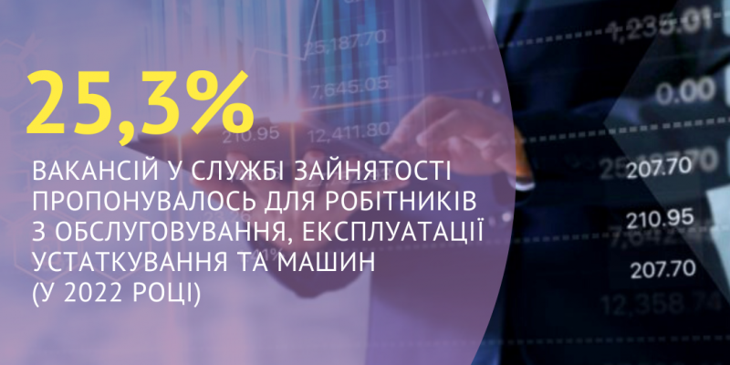 25,3% вакансій у Харківській обласній службі зайнятості пропонувалось для працевлаштування робітників з обслуговування, експлуатації устаткування та машин (у 2022 році)