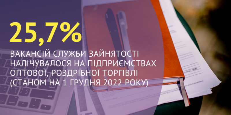 25,7% вакансій Харківської обласної служби зайнятості налічувалося на підприємствах оптової, роздрібної торгівлі (станом на 1 грудня 2022 року)