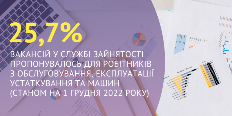 25,7% вакансій у Харківській обласній службі зайнятості пропонувалось для робітників з обслуговування, експлуатації устаткування та машин (станом на 1 грудня 2022 року)
