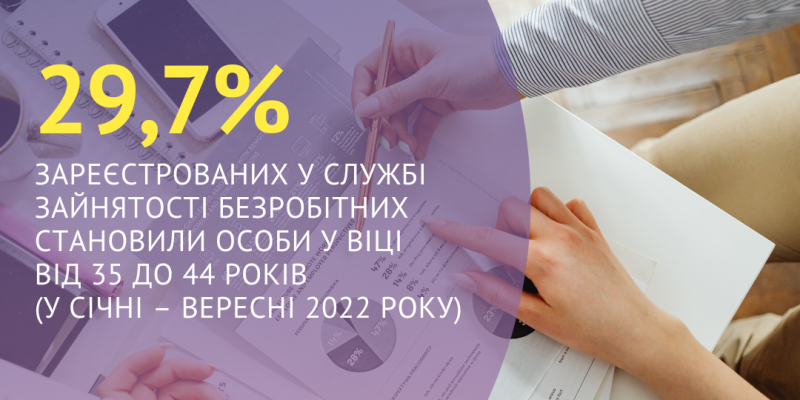 29,7% зареєстрованих у Харківській обласній службі зайнятості безробітних становили особи у віці від 35 до 44 років (у січні – вересні 2022 року)