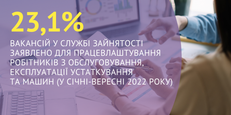 23,1% вакансій у Харківській обласній службі зайнятості заявлено для працевлаштування робітників з обслуговування, експлуатації устаткування та машин (у січні-вересні 2022 року)