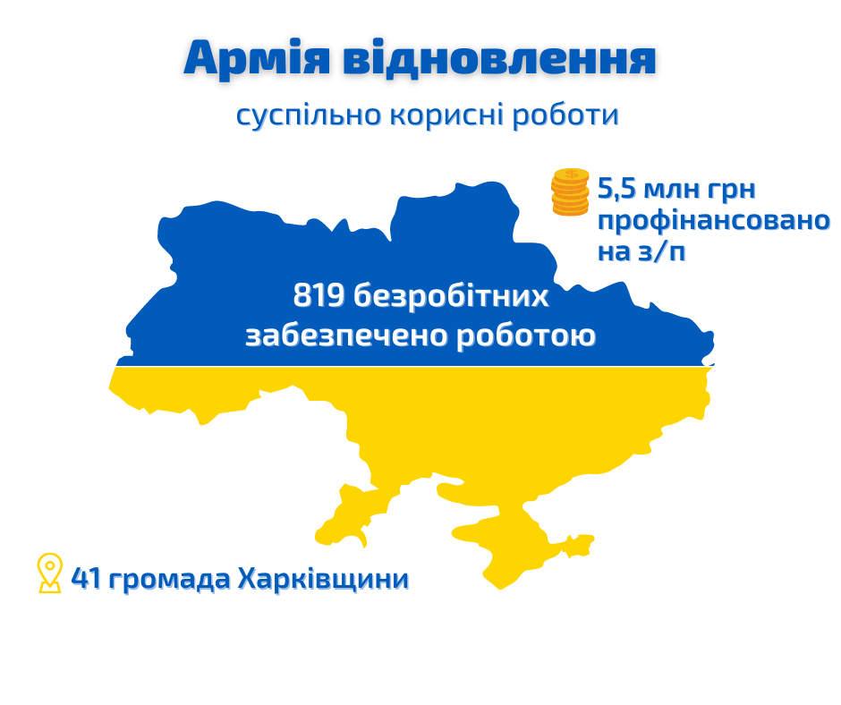 До виконання суспільно корисних робіт з відбудови країни в рамках проєкту «Армія відновлення» на Харківщині залучено 819 безробітних у 41 громаді.