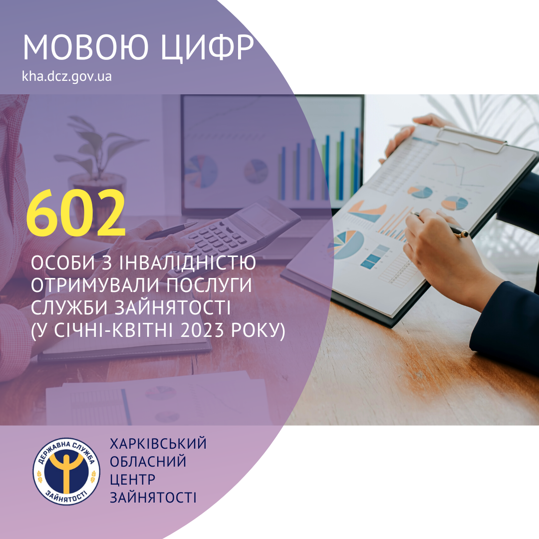 602 особи з інвалідністю отримували послуги Харківської обласної служби зайнятості (у січні-квітні 2023 року).