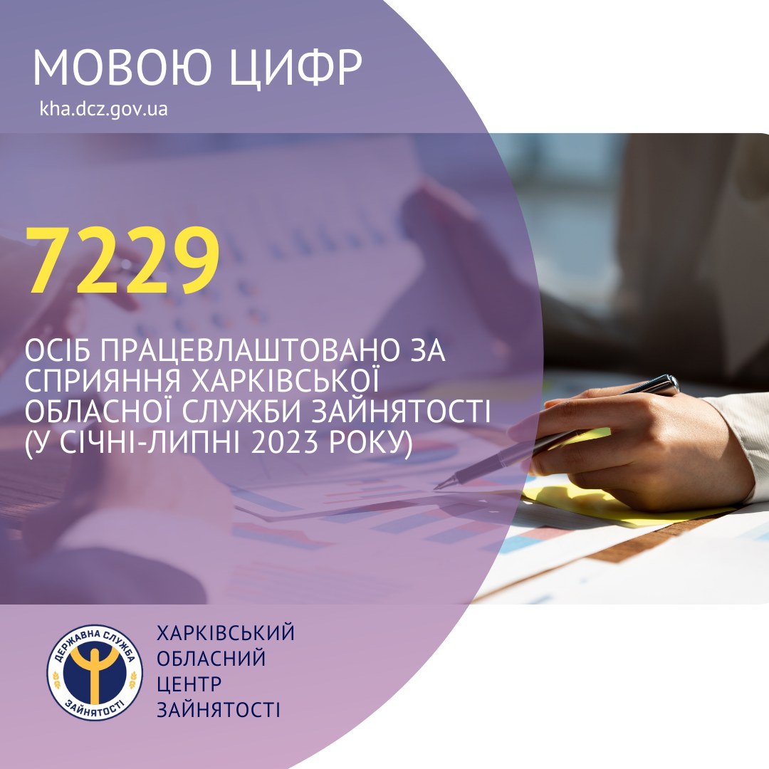 7229 осіб працевлаштовано за сприяння Харківської обласної служби зайнятості (у січні-липні 2023 року).