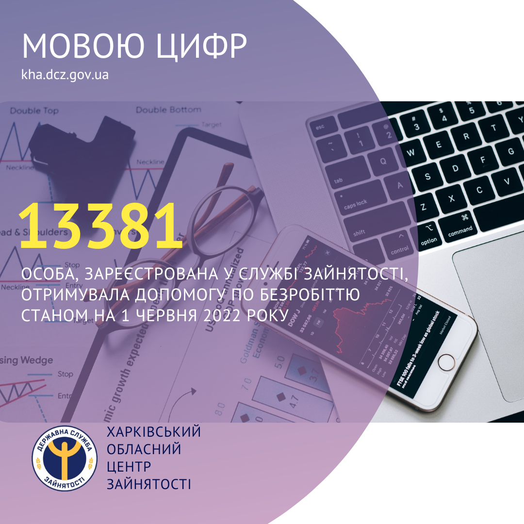 13381 особа, зареєстрована у Харківській обласній службі зайнятості, отримувала допомогу по безробіттю станом на 1 червня 2022 року.