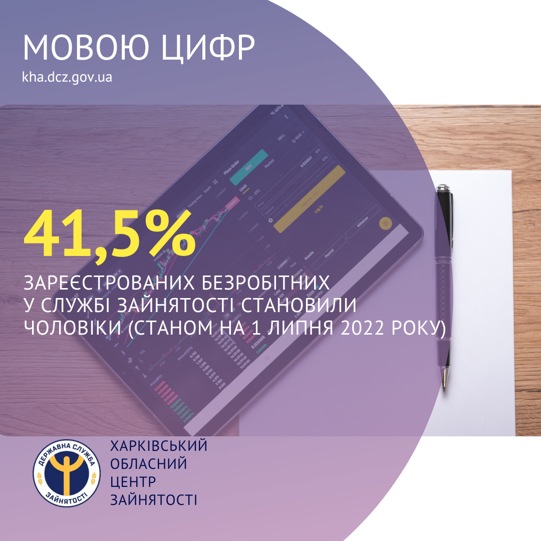21.07.2022 | 11:12 Facebook Twitter Google+ 41,5% загальної кількості зареєстрованих безробітних у Харківській обласній службі зайнятості становили чоловіки (станом на 1 липня 2022 року).