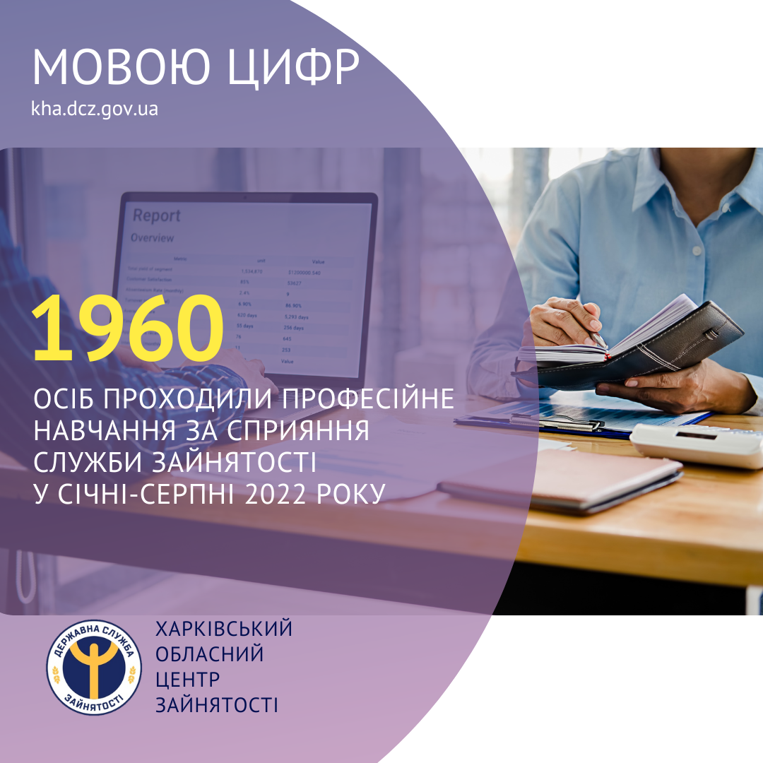 1960 осіб проходили професійне навчання за сприяння Харківської обласної служби зайнятості протягом січня-серпня 2022 року.