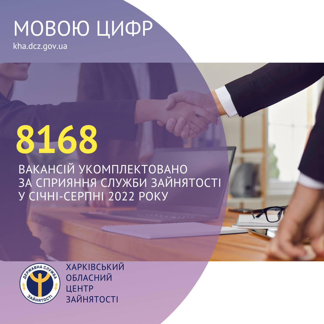 8168 вакансій укомплектовано за сприяння Харківської обласної служби зайнятості протягом січня-серпня 2022 року.