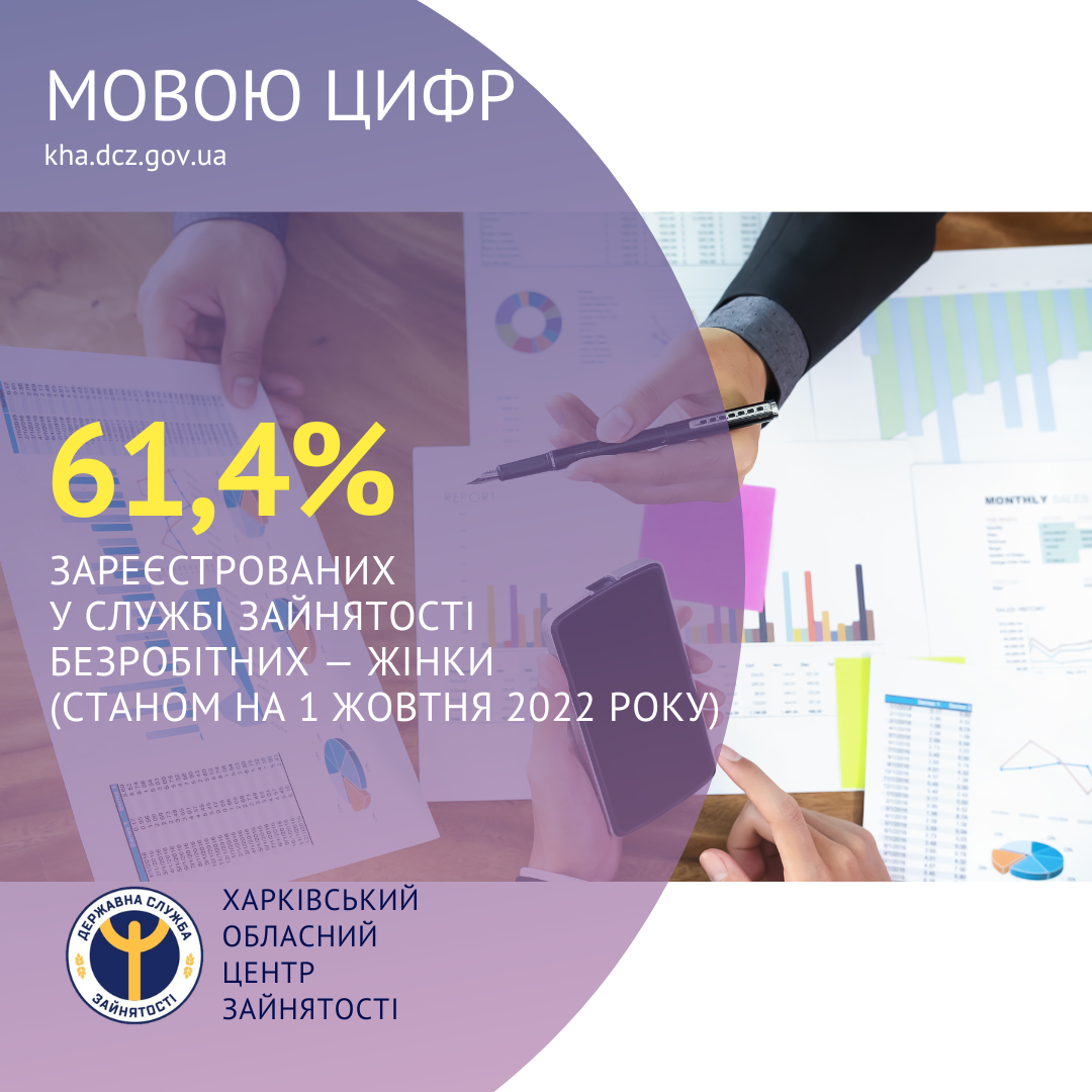 61,4% зареєстрованих у Харківській обласній службі зайнятості безробітних — жінки (станом на 1 жовтня 2022 року).