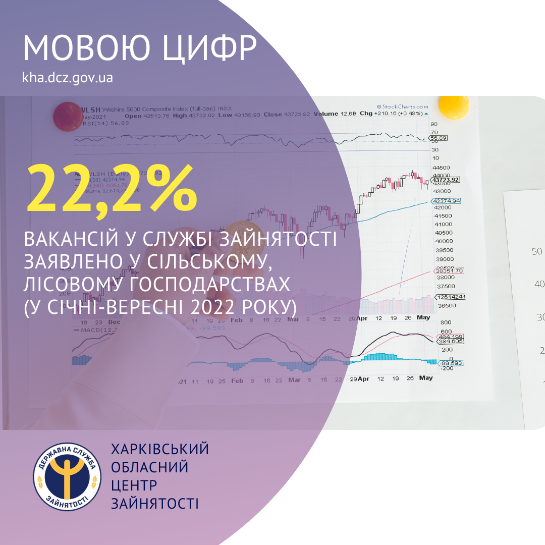 22,2% вакансій у Харківській обласній службі зайнятості заявлено у сільському, лісовому господарствах (у січні-вересні 2022 року).