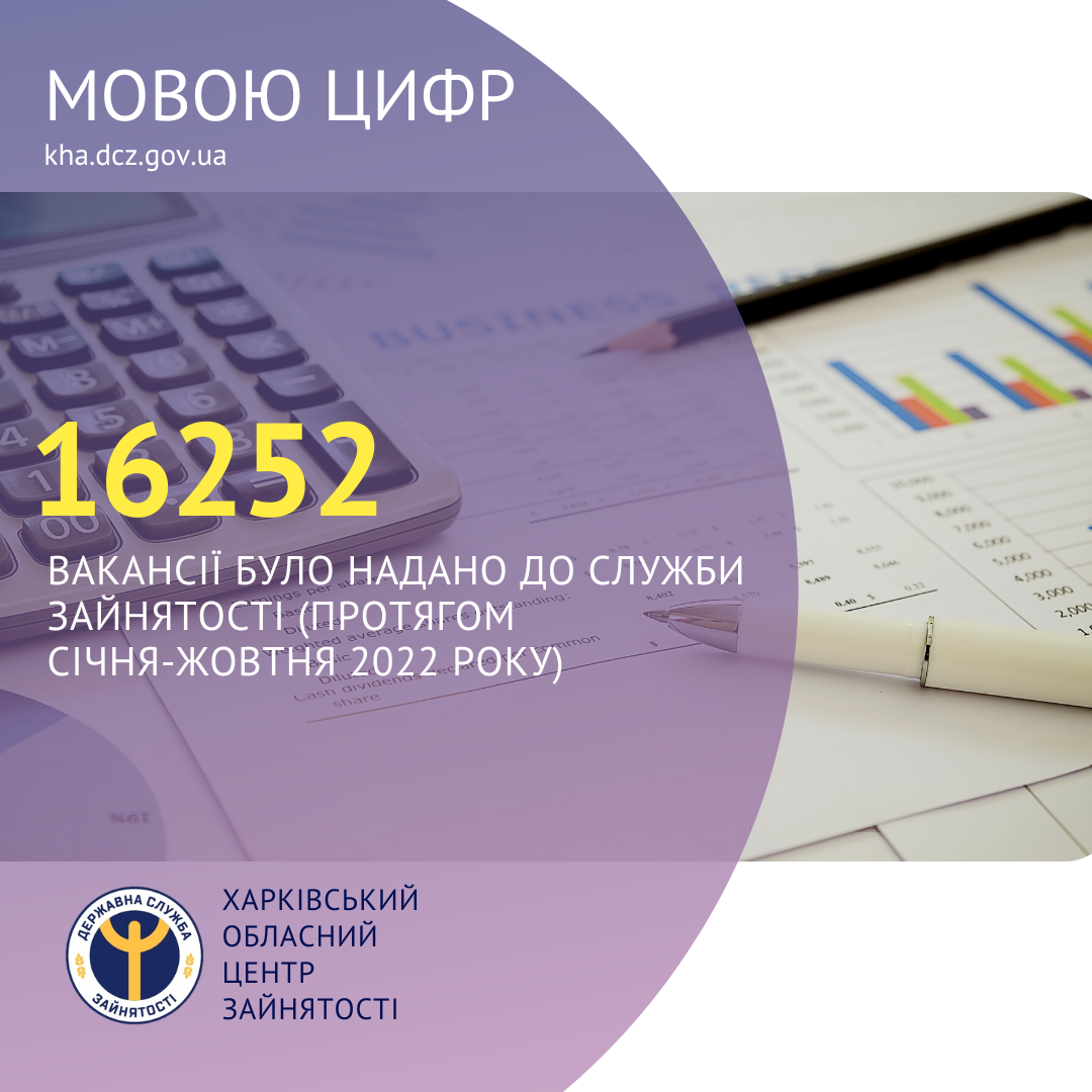 16252 вакансії було надано до Харківської обласної служби зайнятості (протягом січня-жовтня 2022 року).