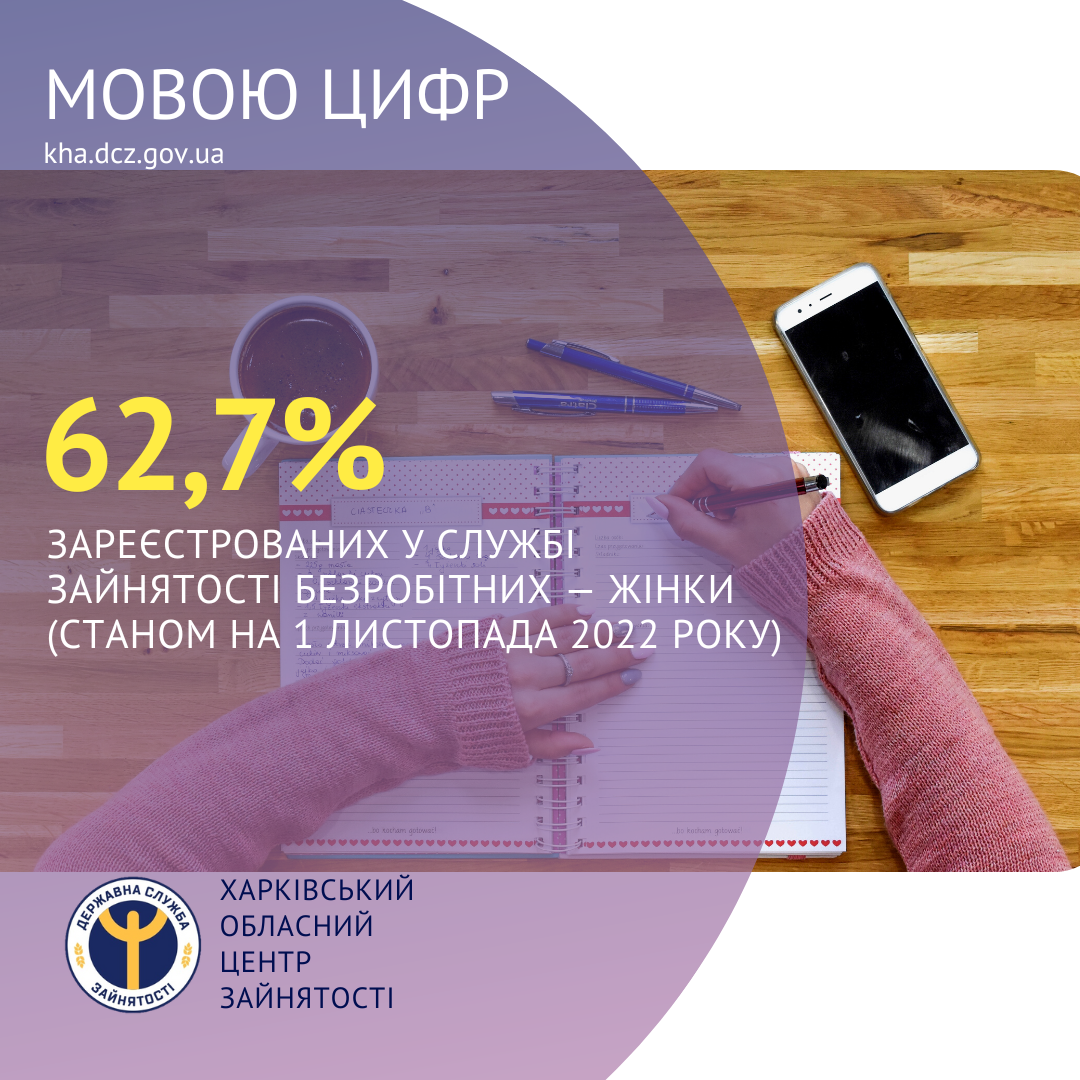 62,7% зареєстрованих у Харківській обласній службі зайнятості безробітних — жінки (станом на 1 листопада 2022 року).