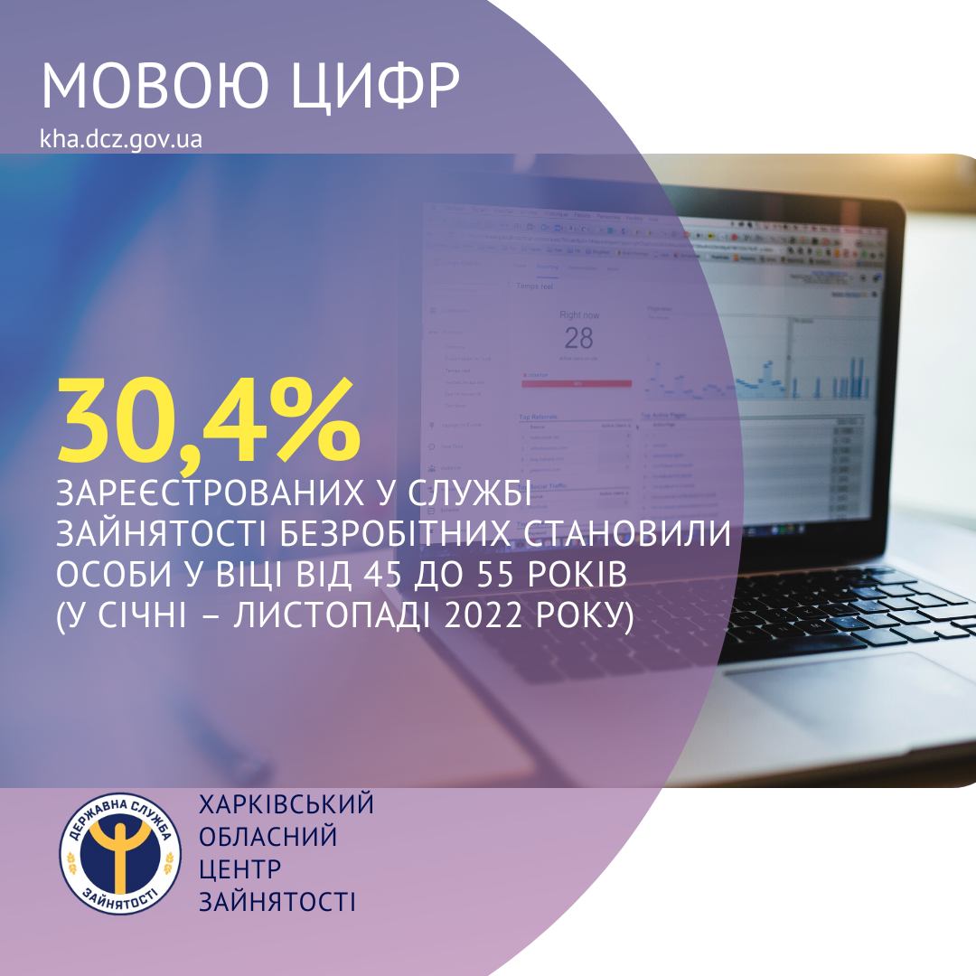 30,4% зареєстрованих у Харківській обласній службі зайнятості безробітних становили особи у віці від 45 до 55 років (у січні – листопаді 2022 року).