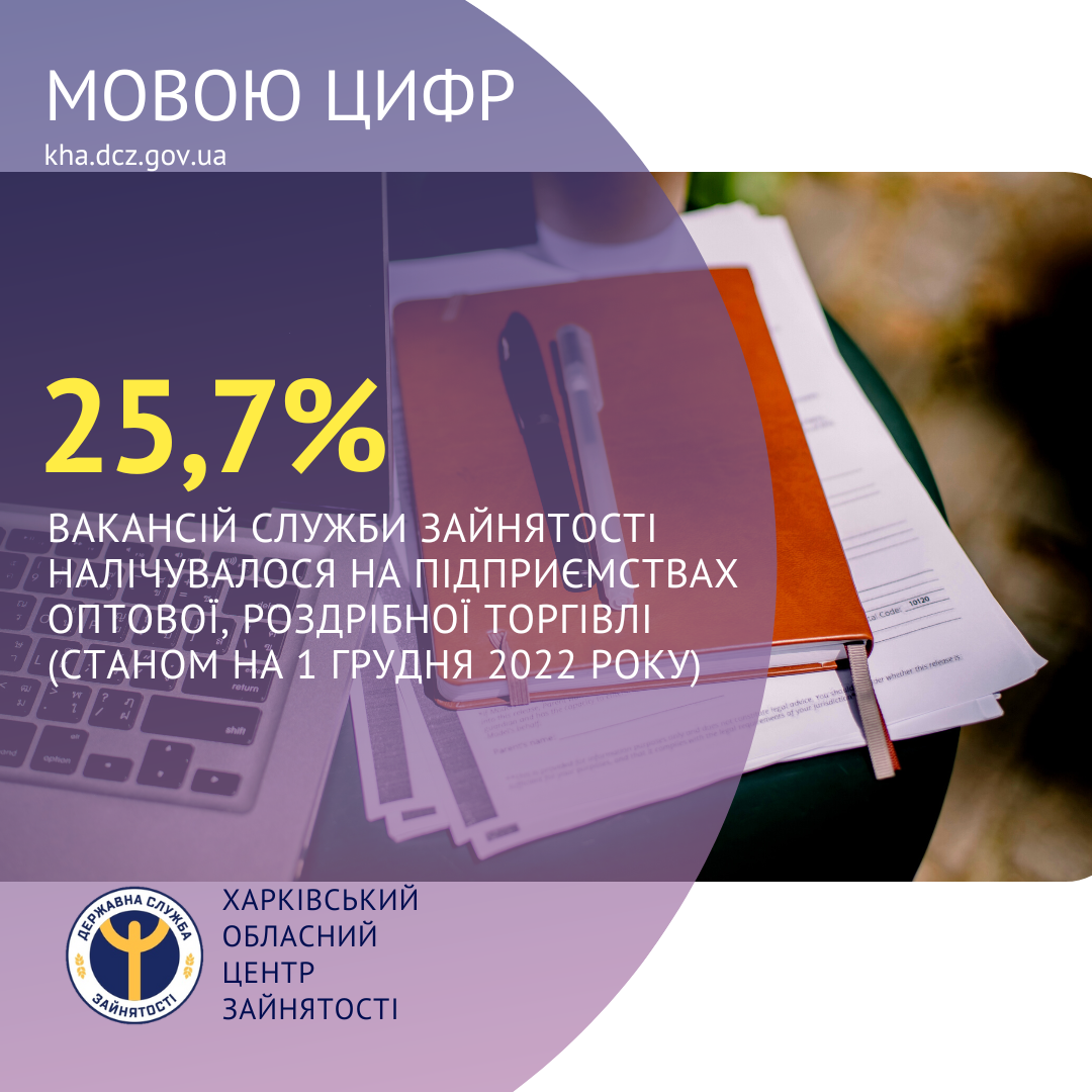 25,7% вакансій Харківської обласної служби зайнятості налічувалося на підприємствах оптової, роздрібної торгівлі (станом на 1 грудня 2022 року).