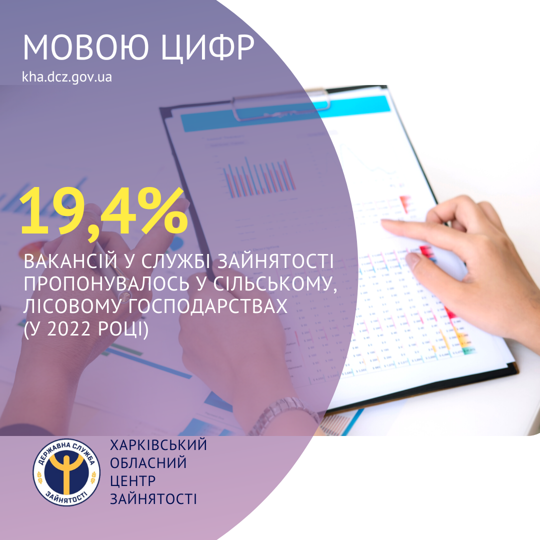 19,4% вакансій у Харківській обласній службі зайнятості пропонувалось у сільському, лісовому господарствах (у 2022 році).