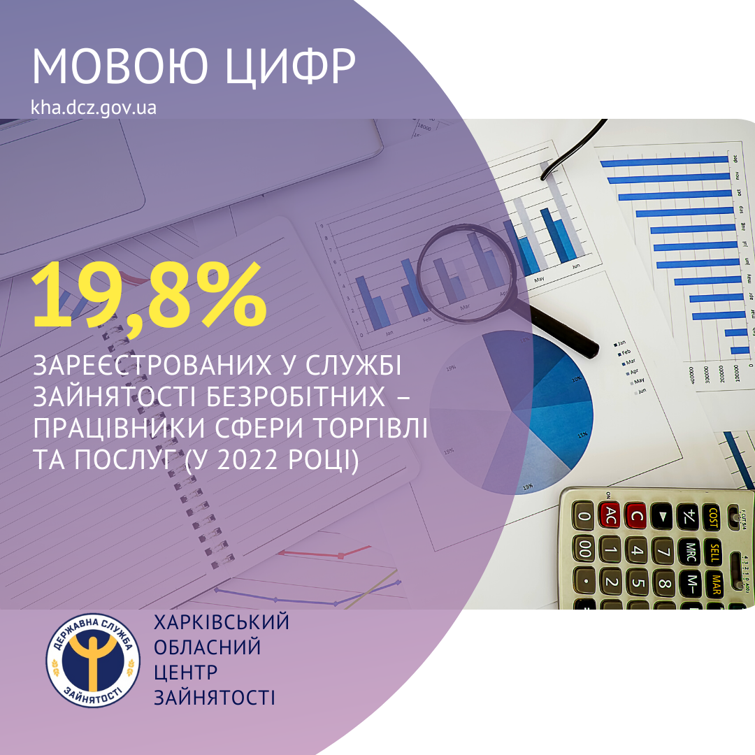 19,8% зареєстрованих у Харківській обласній службі зайнятості безробітних – працівники сфери торгівлі та послуг (у 2022 році).