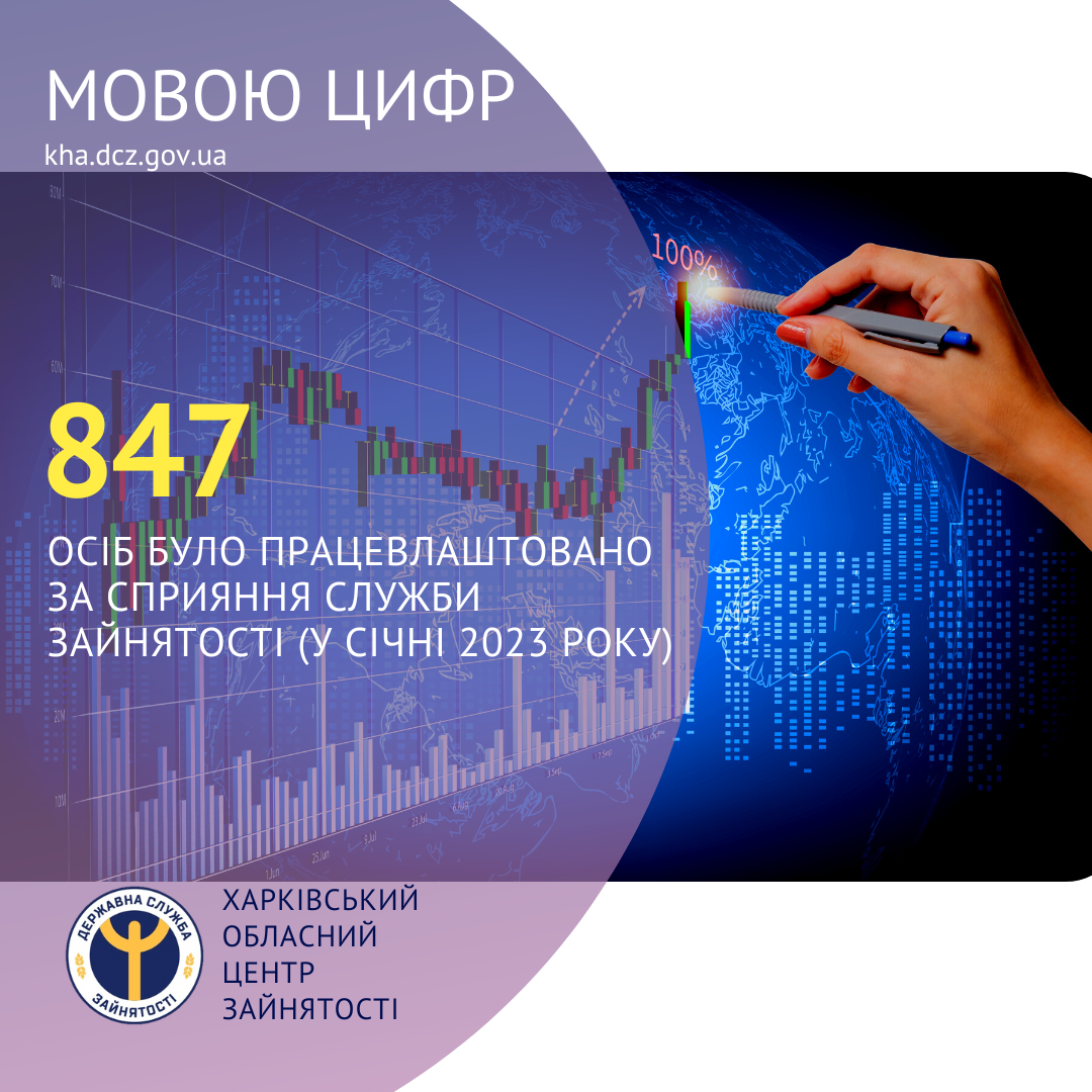 847 осіб було працевлаштовано за сприяння Харківської обласної служби зайнятості (у січні 2023 року).