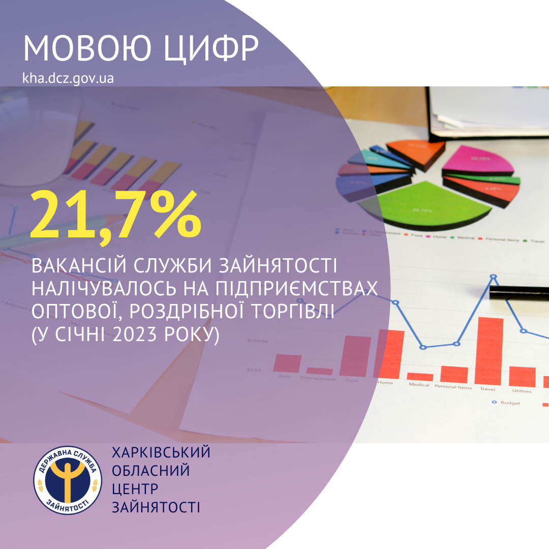 21,7% вакансій Харківської обласної служби зайнятості налічувалось на підприємствах оптової, роздрібної торгівлі (у січні 2023 року).