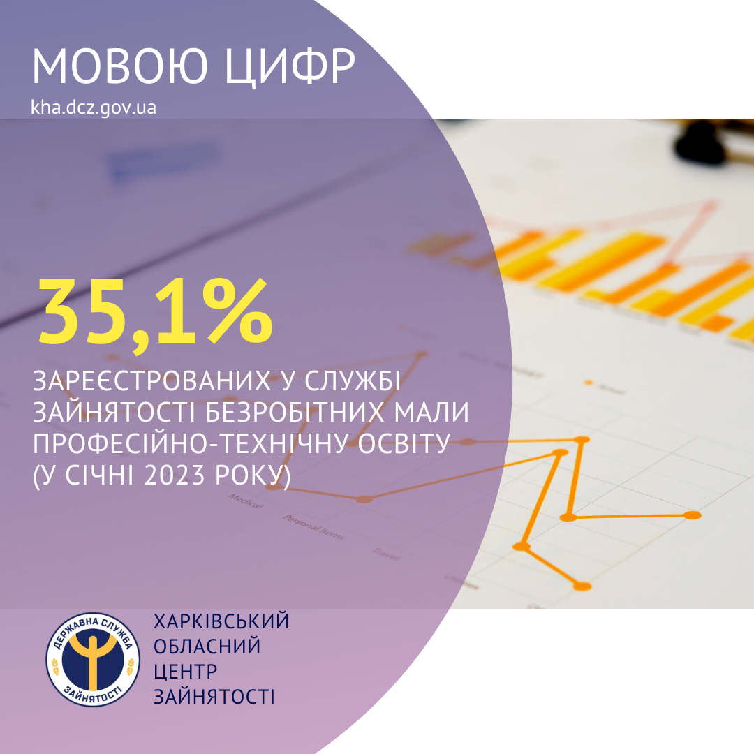 35,1% зареєстрованих у Харківській обласній службі зайнятості безробітних мали професійно-технічну освіту (у січні 2023 року).