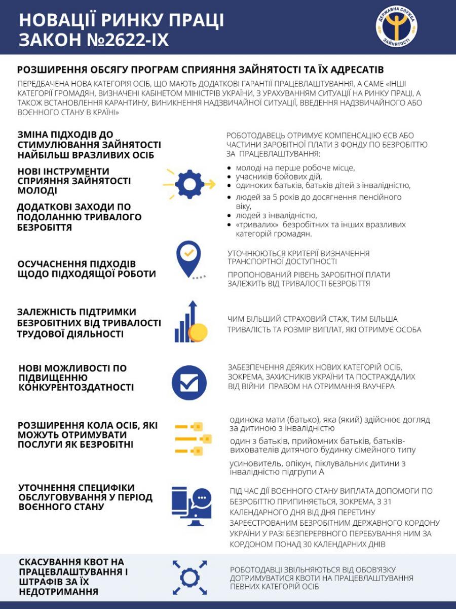 Ним суттєво оновлюється зміст положень Закону України «Про загальнообов’язкове державне соціальне страхування на випадок безробіття» № 1533 (Закон про соціальне страхування на випадок безробіття) та Закону України «Про зайнятість населення» № 5067 (Закон про зайнятість населення). Закон № 2622-IX набирає чинності з 29.10.2022 р., крім положень, які зазначені в пункті 1 Розділу II «Прикінцеві та перехідні положення» Закону № 2622-IX.