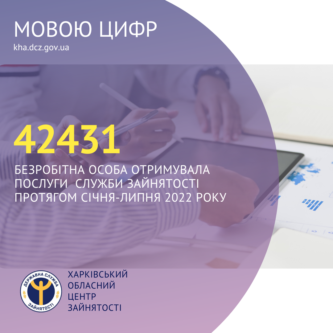 42431 безробітна особа отримувала послуги Харківської обласної служби зайнятості протягом січня-липня 2022 року.