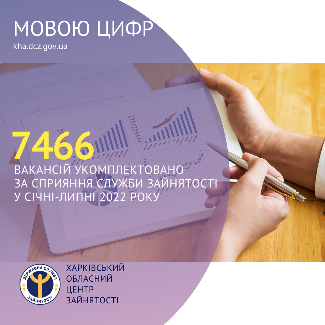 7466 вакансій укомплектовано за сприяння Харківської обласної служби зайнятості протягом січня-липня 2022 року.