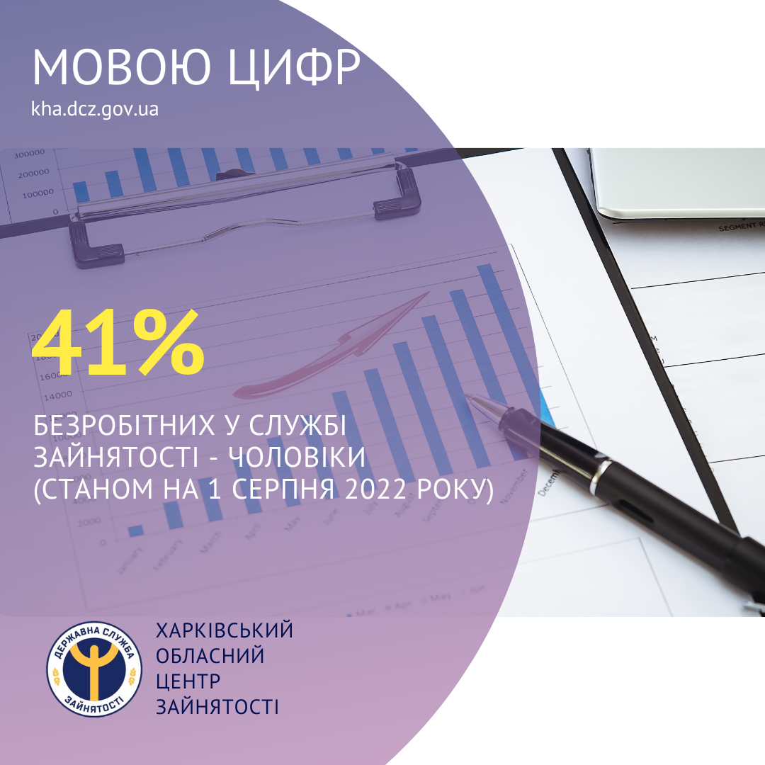 41% від загальної кількості зареєстрованих безробітних у Харківській обласній службі зайнятості становили чоловіки (станом на 1 серпня 2022 року).