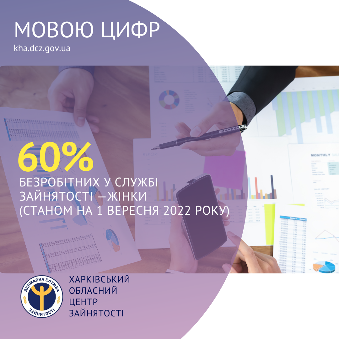 60% зареєстрованих у Харківській обласній службі зайнятості безробітних — жінки (станом на 1 вересня 2022 року).