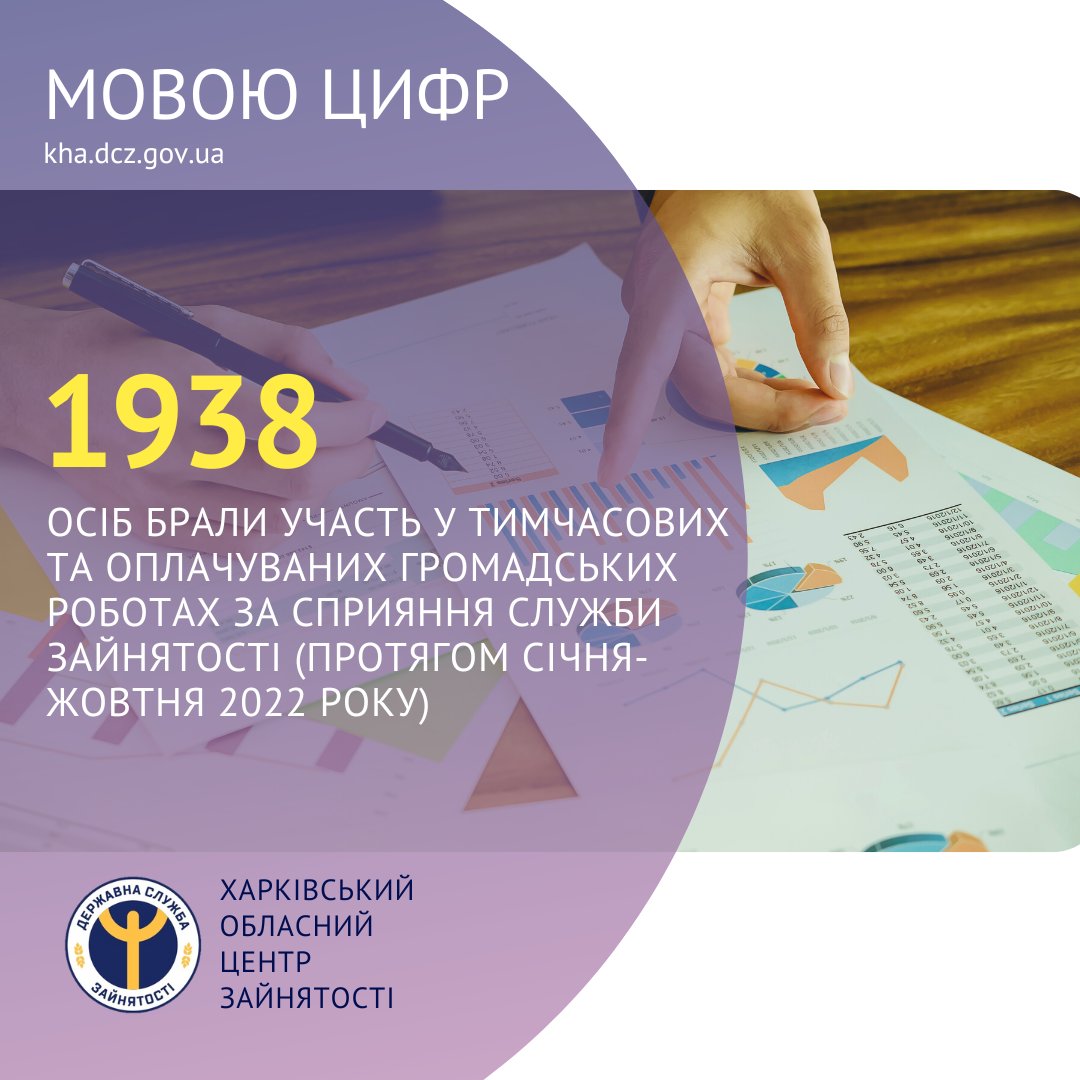 1938 осіб брали участь у тимчасових та оплачуваних громадських роботах за сприяння Харківської обласної служби зайнятості (протягом січня-жовтня 2022 року).