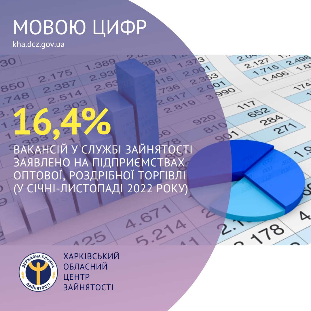 16,4% вакансій у Харківській обласній службі зайнятості заявлено на підприємствах оптової, роздрібної торгівлі (у січні-листопаді 2022 року).