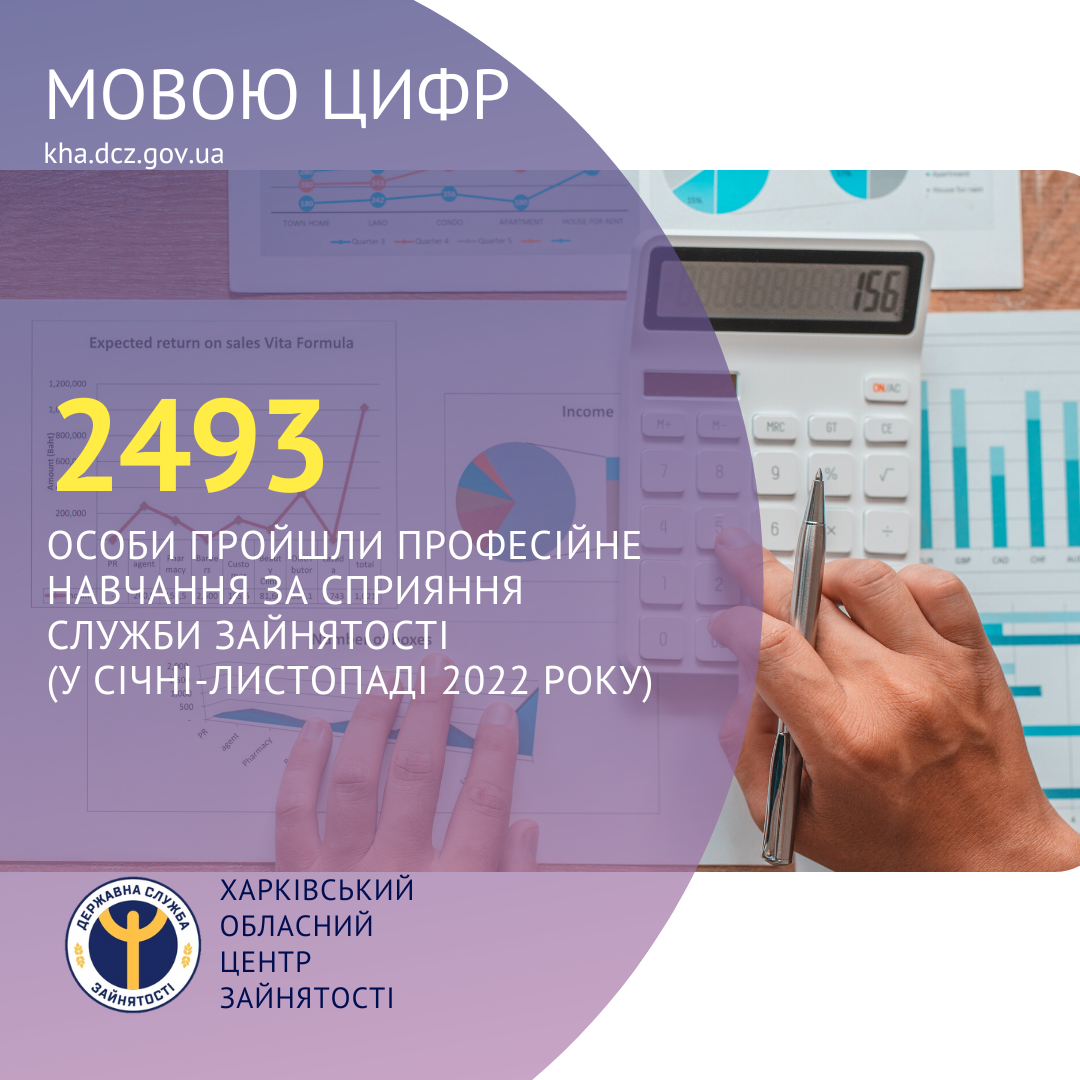 2493 особи пройшли професійне навчання за сприяння Харківської обласної служби зайнятості (протягом січня-листопада 2022 року).
