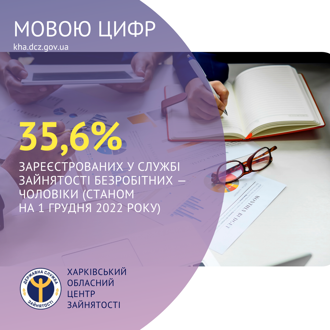 35,6% зареєстрованих у Харківській обласній службі зайнятості безробітних — чоловіки (станом на 1 грудня 2022 року).