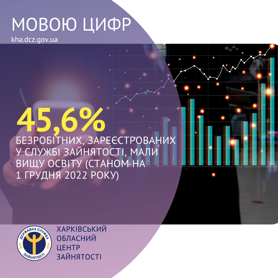 45,6% безробітних, зареєстрованих у Харківській обласній службі зайнятості, мали вищу освіту (станом на 1 грудня 2022 року).