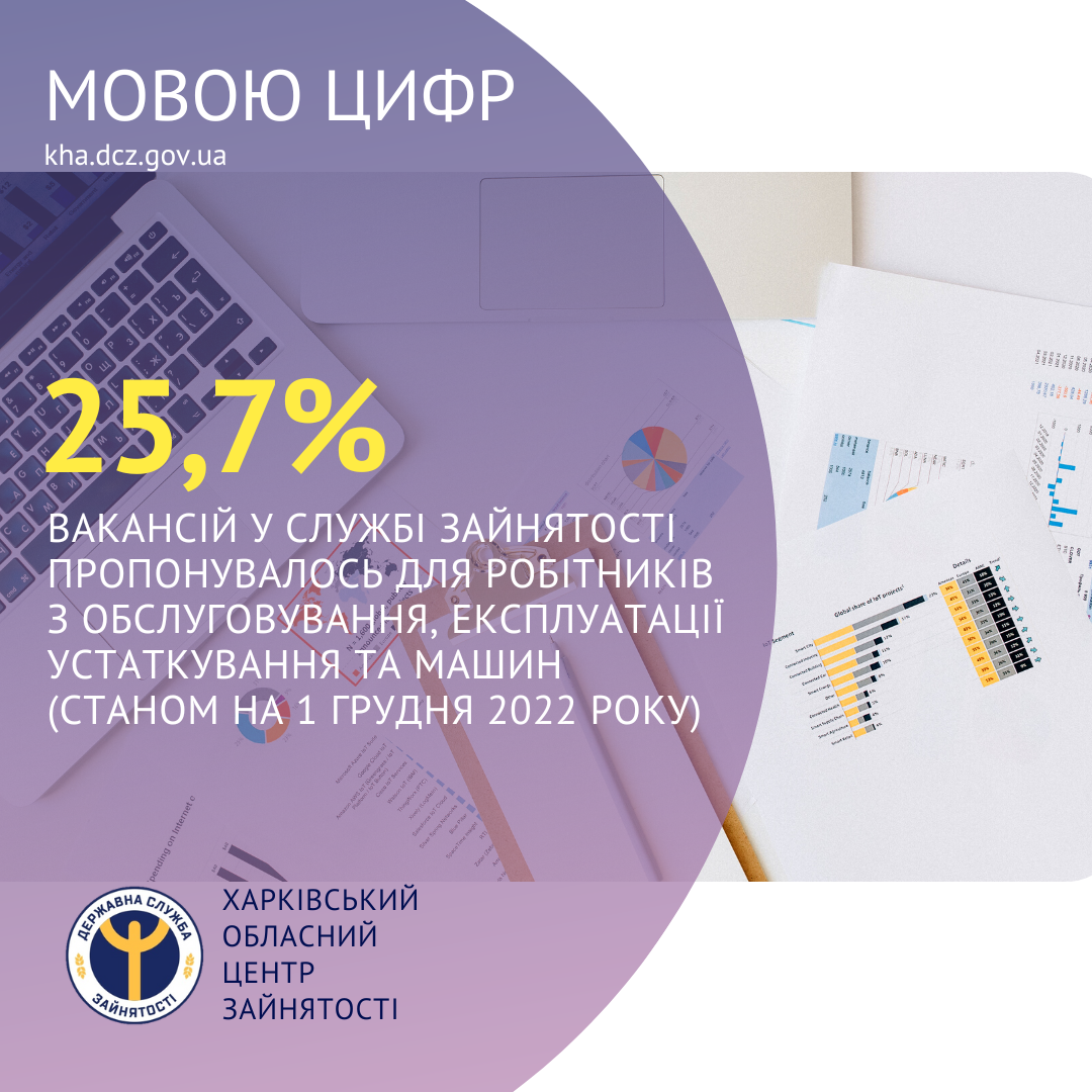 25,7% вакансій у Харківській обласній службі зайнятості пропонувалось для робітників з обслуговування, експлуатації устаткування та машин (станом на 1 грудня 2022 року).