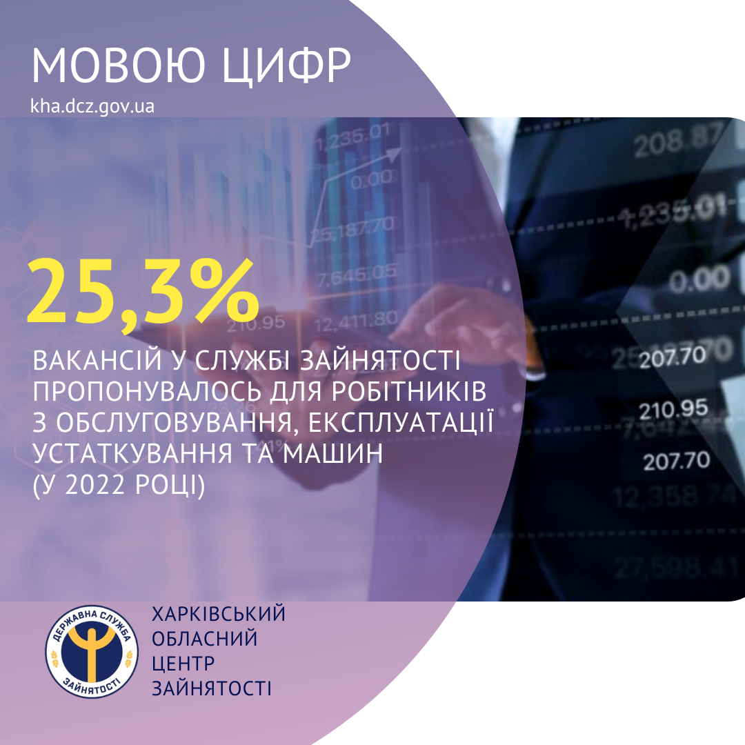 25,3% вакансій у Харківській обласній службі зайнятості пропонувалось для працевлаштування робітників з обслуговування, експлуатації устаткування та машин (у 2022 році).